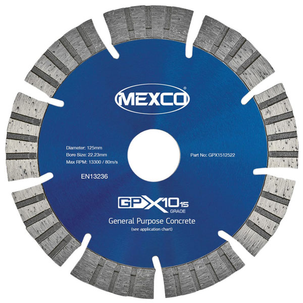 MEXCO GPX10-15 Concrete Diamond Blades have been specifically designed for cutting a wide range of general purpose building materials. The GPX10-15 offers a cost effective solution for the user who requires a diamond blade which can cope with the cutting of the most widely used non-abrasive building materials.