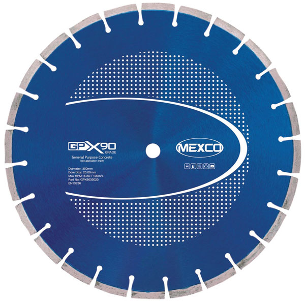 MEXCO GPX90 Concrete Diamond Blades provide the user with excellent cutting characteristics in the majority of non-abrasive construction products used in the UK.