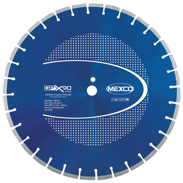 MEXCO GPX90 Concrete Diamond Blades provide the user with excellent cutting characteristics in the majority of non-abrasive construction products used in the UK.