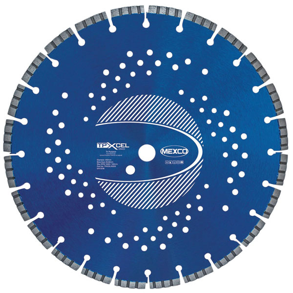 This MEXCO XCEL Grade Tri-Purpose Diamond Blade is made for superior cutting performance on all general purpose building and construction materials including abrasive, non abrasive and asphalt. Designed specifically to take away the hassle of having to change diamond blades for different materials.