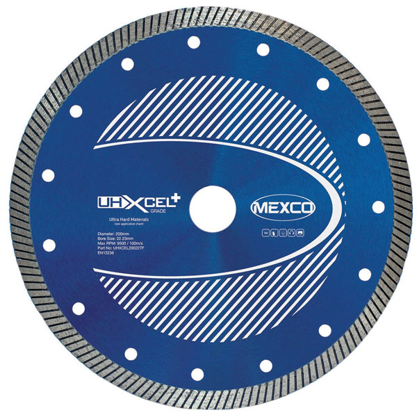 MEXCO UHXCEL+ Ultra Hard Plus Diamond Blades have been specifically designed and manufactured for fast, clean cutting with reduced chipping. Suitable for ultra hard materials such as; Granite, Porcelain, Marble, Ceramic Tiles, Clay Roof Tiles and other hard natural stone and man-made fired materials.