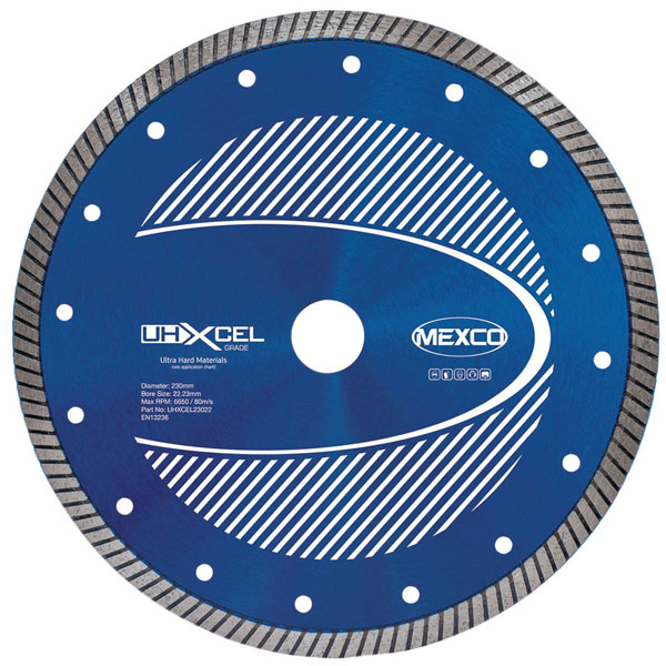 MEXCO UHXCEL Ultra Hard Plus Diamond Blades have been specifically designed and manufactured for cutting ultra hard materials such as; Granite, Porcelain, Marble, Ceramic Tiles, Clay Roof Tiles and other hard natural stone and man-made fired materials.