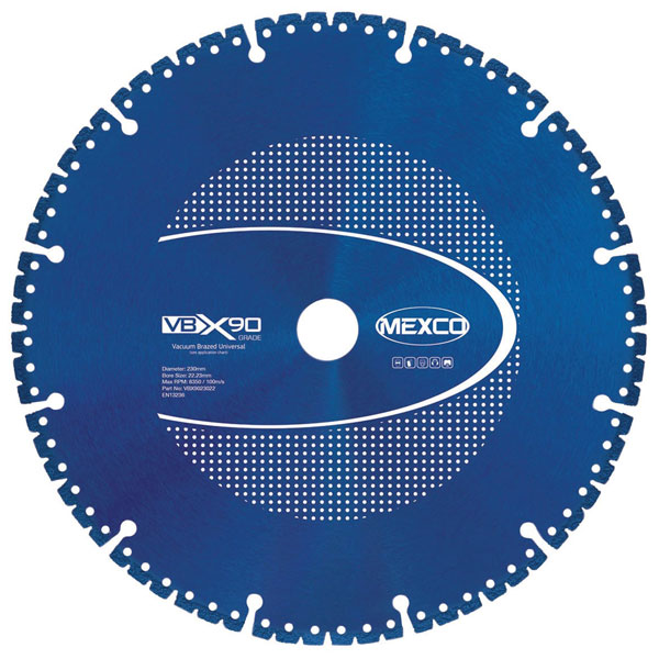 MEXCO VBX90 Grade Universal Diamond Blade. The VBX90 uses a process of vacuum brazing to attach large pieces of diamond grit to the cutting edge of a steel centre; this manufacturing process allows the diamond grit to be held constantly in contact with the material being cut producing very fast and effective stock removal.
