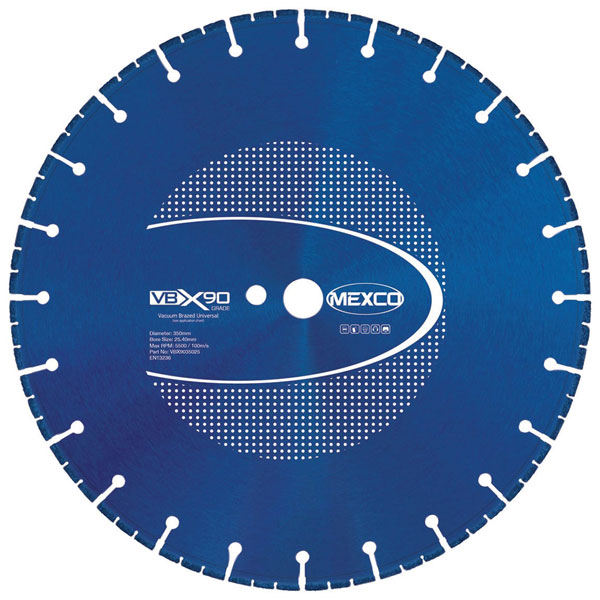 MEXCO VBX90 Grade Universal Diamond Blade. The VBX90 uses a process of vacuum brazing to attach large pieces of diamond grit to the cutting edge of a steel centre; this manufacturing process allows the diamond grit to be held constantly in contact with the material being cut producing very fast and effective stock removal.