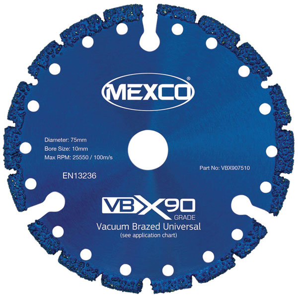 MEXCO VBX90 Grade Universal Diamond Blade. The VBX90 uses a process of vacuum brazing to attach large pieces of diamond grit to the cutting edge of a steel centre; this manufacturing process allows the diamond grit to be held constantly in contact with the material being cut producing very fast and effective stock removal.