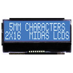 A 16 character x 2 line display that features a LED backlight transmissive display with a white on blue colour scheme. The display is of the Super-Twisted Nematic (STN) type and uses Chip-On-Glass technology.