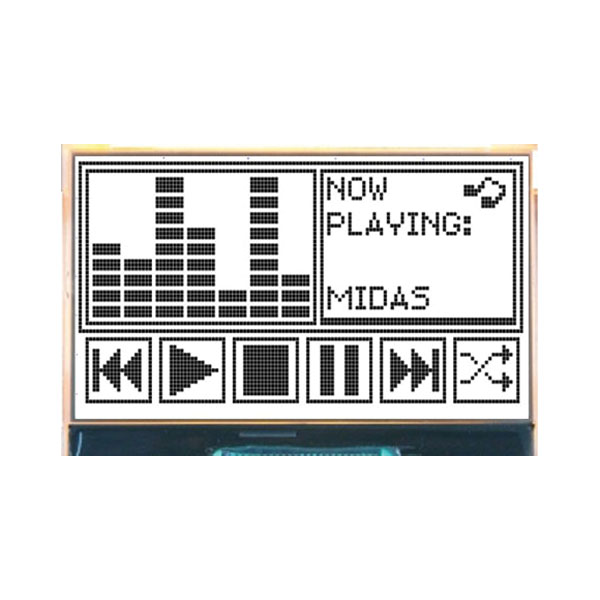 A graphic LCD display in a 240 x 128 dot matrix format. Mechanical construction is of the Chip-On-Glass (COG) type and the LCD is a Film-compensated Super Twisted Nematic (FSTN) display. The positive mode is created by a white LED backlight on a blue background and the display is of the transflective type, combining the best features of reflective and transmissive displays.
