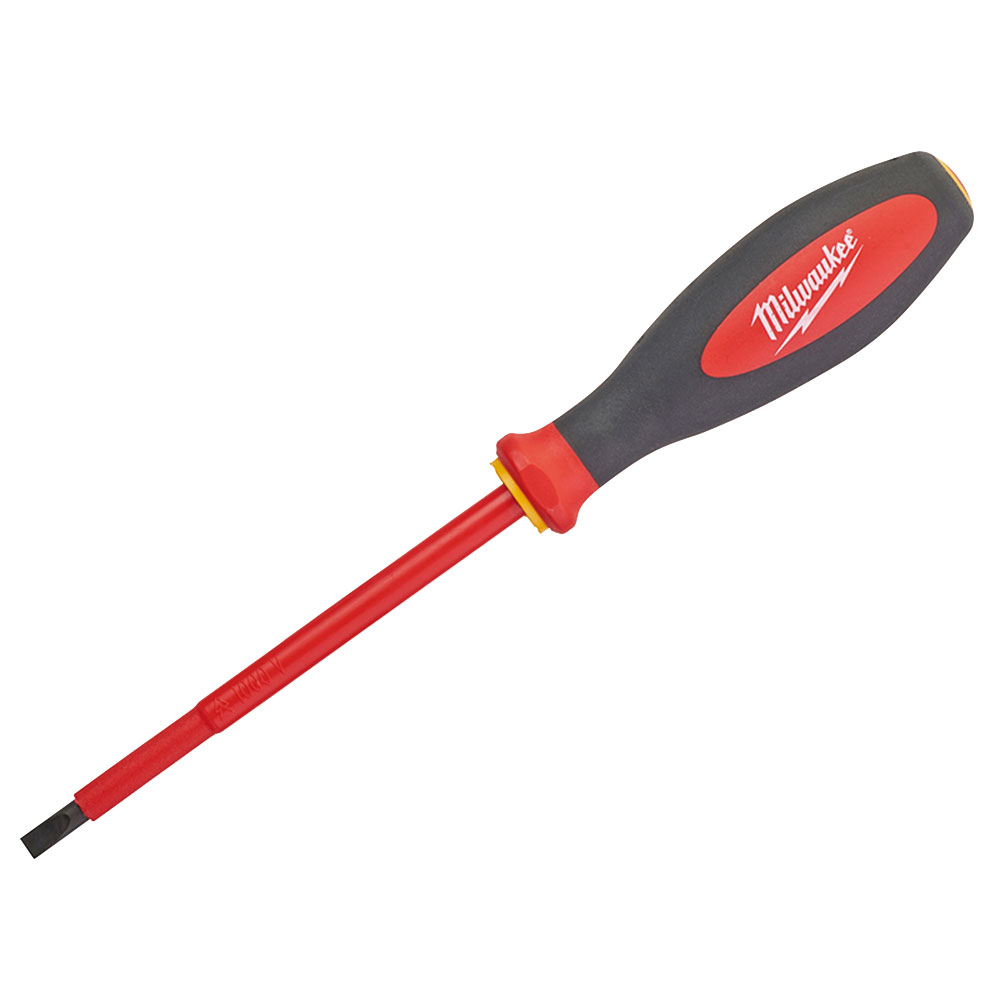 Milwaukee Hand Tools Slotted VDE Screwdrivers are manufactured from premium steel, molybdenum and vanadium for flexibility and durability. They have a CNC ground screwdriver tip that sits accurately within the screw head and does not move accidentally. Black phosphate coating improves grip and helps prevent rust.