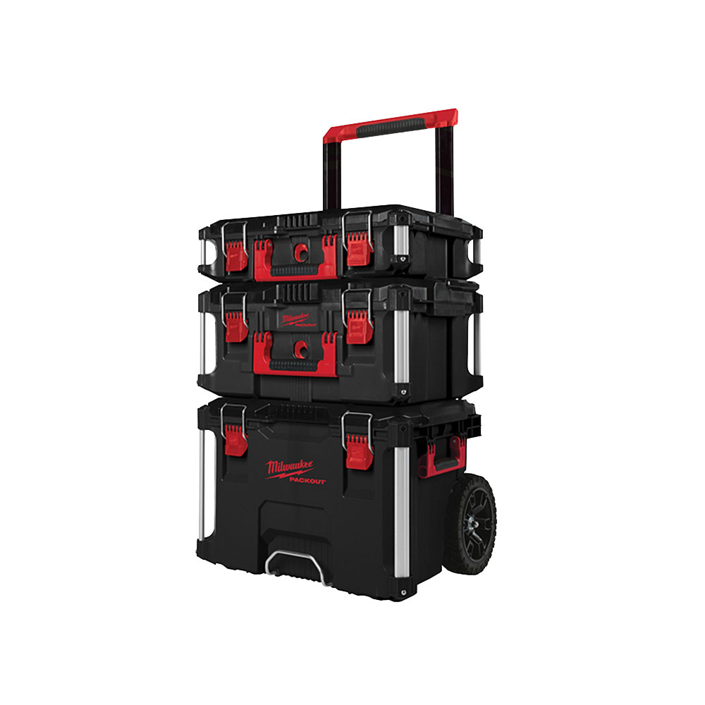 The Milwaukee Hand Tools PACKOUT™ Trolley Set contains a selection of cases constructed from impact-resistant polymers for jobsite durability. With reinforced metal corners and locking points.