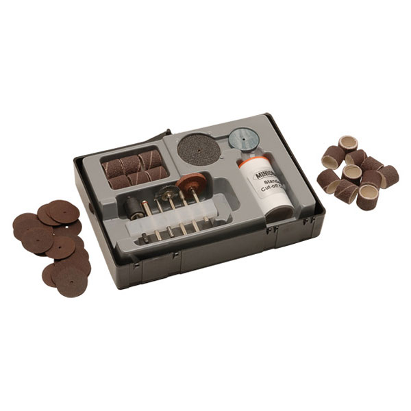 100 Piece Heavy-Duty Accessories Kit, Set of 100 Pieces, Kit Contents: 75 Standard Cutting Discs, 2 Fibreglass Reinforced Cutting Discs, Rubber Polishing Wheel, Mandrel, 8 Sanding Drums 13Mm Dia. Coarse Grade, 8 Sanding Drums 13Mm Dia. Fine Grade, Mandrel Sanding Drum 13Mm Dia, Wire Brush, Steel, Grinding Stone, Aluminium Oxide, High Speed Cutter, Diamond Engraving Bit, Cylinder, Range of Applications Such as Sanding, Shaping, Polishing, Cleaning, Cutting, Grinding, Carving and Engraving, Mini Power Tools, Supplied in Set of 100