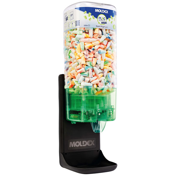 Moldex Spark Plugs® TouchFree PlugStation 500 for maximum hygiene. The sensor-controlled, battery-operated dispenser distributes one pair of earplugs at a time. Supplied with 500 pairs of Spark Plugs® earplugs, SNR 35 dB and a Wall Mount (MOL7060). Can be refilled when required.