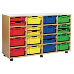 A rack with 16 compartments containing various quantities of shallow or deep Gratnell's Trays. Each compartment takes one deep tray or two shallow trays. The rack holds the trays in four vertical columns and has castors for easy movement.