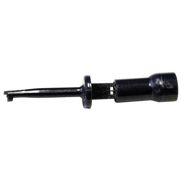 The Mueller Electric BU-00208-0 is a black plunger clip designed for secure and versatile connections. This alligator clip, also known as a crocodile clamp, ensures reliable contact for electrical testing. It is commonly used in laboratory and electronics testing environments.
