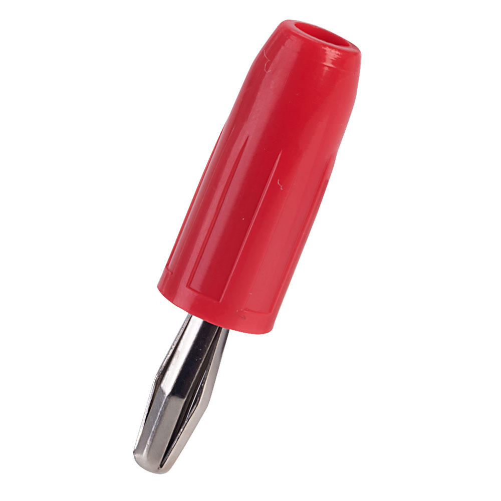 A red 4mm banana plug that connects to a cable by means of soldering.