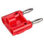A red, stackable, dual 4mm banana plug that connects to cables by means of set screws in the side of the plug body.