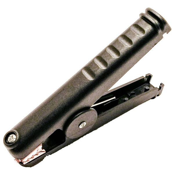 The Mueller Electric BU-102BK-0 Battery clip is a black alligator clamp with a maximum clamping range of 41 mm and a length of 165 mm. This robust crocodile clamp is typically used for secure connections in electrical testing and circuit experimentation. It is ideal for professionals needing reliable Hirschmann-style clips in varied testing environments.