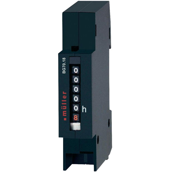 The Muller BW 7018 Operating Hours Counter is suitable for installation in DIN Rail and uses a 230V DC power supply. The 5-digit, 7-segment counter on the front panel is easy to read. The counter is easy to install and has screw terminals and touch proof connections. The slim-fit flush mount counter measures 85 x 17.5mm.