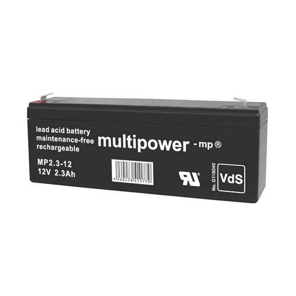 Multipower 301074, MP2,3-12, is a versatile lead acid battery designed for reliable performance, particularly suitable for applications requiring a maintenance-free solution. This valve-regulated lead-acid (VRLA) battery delivers a nominal voltage of 12 volts and a capacity of 2.3 ampere-hours, utilising absorbent glass mat (AGM) technology to ensure low self-discharge levels. The compact dimensions of 178 x 66 x 34 mm and inclusion of 4.8 mm blade terminals facilitate easy integration into diverse systems. With its VDS certificate, this battery is suitable for use in security systems, emergency lighting, and uninterruptible power supplies, where consistent energy delivery and dependability are crucial. The robust design and maintenance-free operation make it an excellent choice for engineers looking to implement durable power solutions.