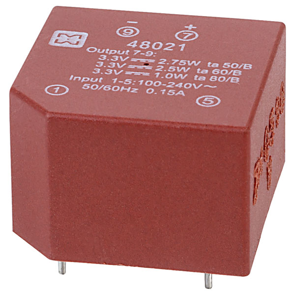 A 2.75W, 3.3V DC power supply from the 48000 series of single output power supplies. The PSUs have a universal AC/DC input range and come in a compact, encapsulated PCB mounting package with the same footprint as the EE20 transformer, allowing you to upgrade your applications without having to redesign your PCBs.