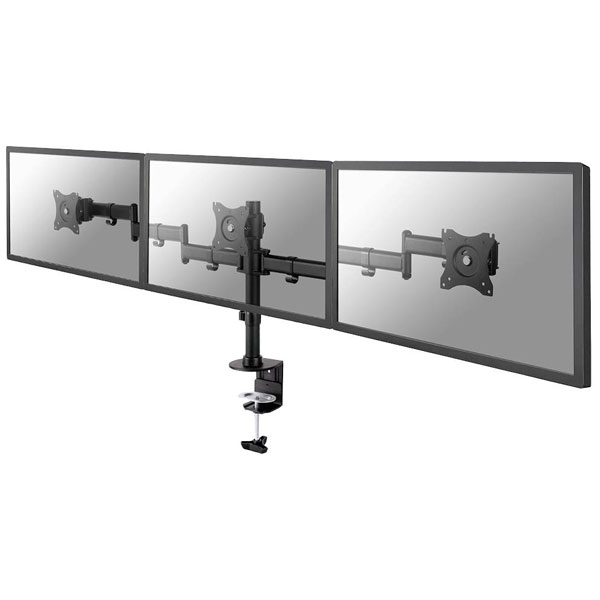 Neomounts NM-D135D3BLACK is a versatile desk mount engineered to support three monitors, accommodating screen sizes ranging from 25.4 cm (10 inches) to 68.6 cm (27 inches). Designed for multifunctional use, it features both tiltable and swivelling capabilities, allowing precise positioning for optimal ergonomic viewing. Made in a sleek black finish, the mount offers a robust solution for environments that require simultaneous visibility across multiple displays, such as control rooms, financial trading floors, and technical design workspaces. Its construction supports reliable adjustments, making it an essential component for professionals who need customisable monitor arrangements to enhance productivity and workspace efficiency.