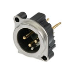 The Neutrik NC3MBAV Vertical Male XLR Socket from the BA Series, is the more economical version of the B Series with circumferential metal flange featuring EMC and RF shielding and mechanical robustness. Three-pole male XLR receptacle, grounding: mating connector shell to pin1 and front panel, horizontal PCB mount.