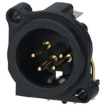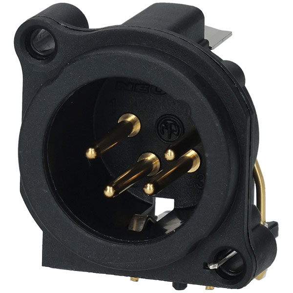 The Neutrik NC4MAH, Horizonal PCB mounting, 4-pole male XLR receptacle has a round plastic body and a separate ground contact to the mating connector shell and front panel.