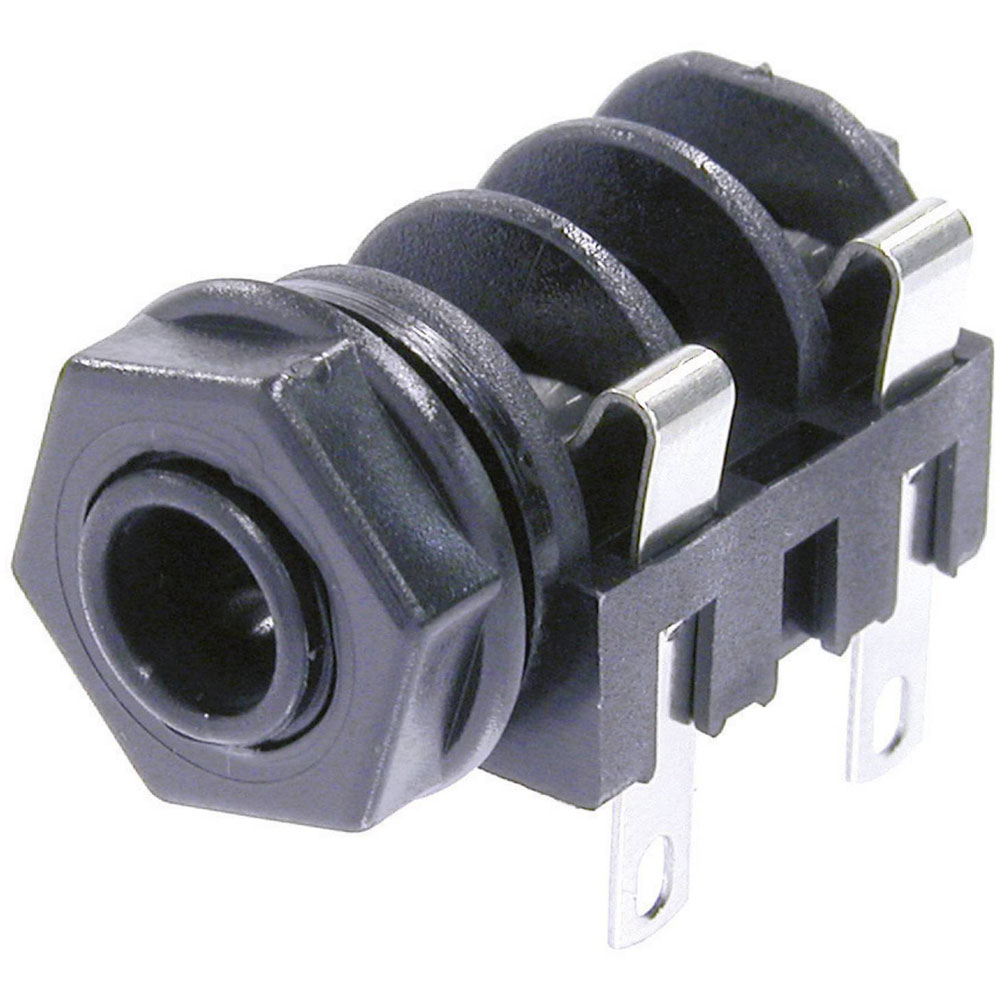 The Neutrik NMJ4HF-S is a 6.35 mm mono audio jack socket designed for horizontal mounting. It features a simple, two-pin configuration and comes in a black colour. This connector is typically used in audio equipment for transmitting mono sound signals.
