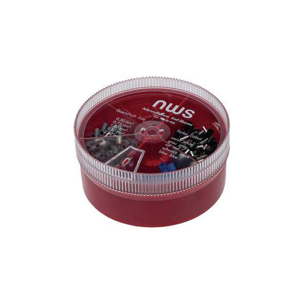 The NWS 144-BI-400 Ferrule set includes 400 partially insulated ferrules in various sizes from 0.5 mm² to 2.5 mm². Manufactured by NWS, this set features ferrules in blue, grey, black, white, and red for easy identification and versatile usage. Ideal for crimping and securing wire connections, these ferrules are commonly used in electrical and electronic applications for reliable performance.