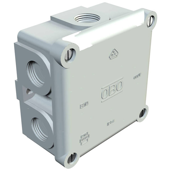 The OBO Bettermann 2002167 junction box measures 91 mm by 91 mm. Ideal for electrical installations, it securely houses and protects wire connections. This robust component serves residential and commercial applications.