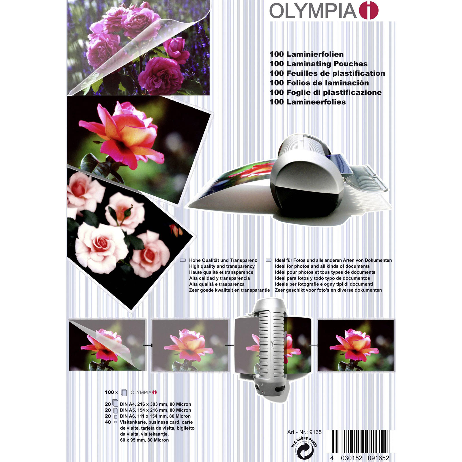 Olympia 9165 Laminate Sheets A4/A5/A6/95x60mm 80 micron 1 Set