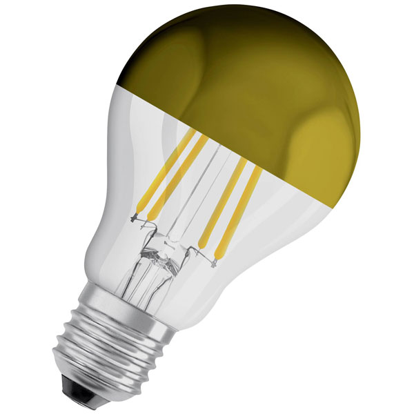 LED lamps, classic piston shape, with mirror piston crown. Product characteristics: Piston crown mirror: Gold or silver. Mercury-free lamps. Product advantages: Long service life of up to 15,000 h. Low power consumption. Easy lamp change thanks to compact design. Instant 100% light, no warm-up time. Lamps with innovative LED filament technology. Application areas: General lighting. Mirror lighting. Outdoor use only in outdoor lights (at least IP65).