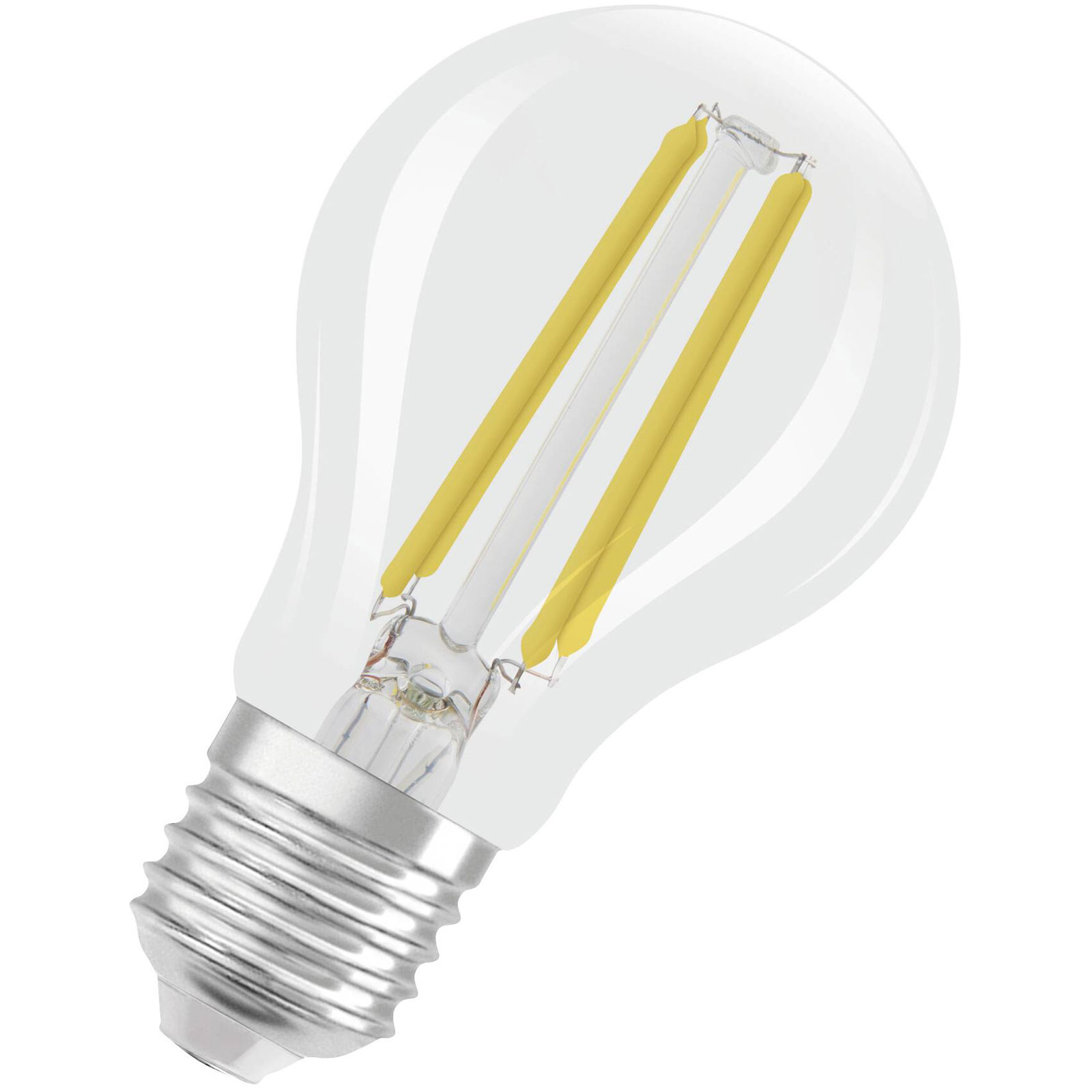 LED LAMPS, classic bulb shape, energy efficiency class A. LED lamps for mains voltage. Transmission angle: Up to 300° Very long average life: 50,000 h . Very high number of switching cycles: 500,000. Light yield: Up to 210 lm/W. Product advantages: Lamps with innovative LED "filament" technology. Design, dimensions, luminous flux comparable to a halogen lamp. Very low power consumption. Instant 100% light, no warm up time. Flicker slightly. Ideal for decorative fittings. Domestic applications. General lighting. For outdoor use only in suitable outdoor lamps.