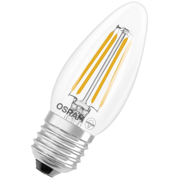 Osram 4099854467066, is the LED Star Classic B 40 Filament 3.4W 827 Clear with an E27 fitting. This LED light bulb features a warm white illumination, making it ideal for indoor applications where ambient and accent lighting is required. With its compact dimensions of 35x35mm and a power rating of 3.4 watts, this bulb efficiently replaces traditional incandescent bulbs, providing significant energy savings while maintaining a clear, warm aesthetic. Well-suited for both residential and commercial settings, this lamp can be used in various indoor light fittings, including decorative fixtures and general lighting purposes, ensuring versatility in design and application.