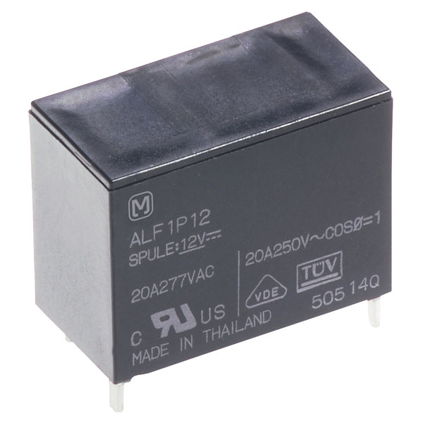 A PCB mounting high power relay from Panasonic for use with home appliances. Especially suitable for compressor and inverter loads. Will withstand a 10, 000V voltage surge. Contacts are silver alloy and configured as 1 form A (normally open).