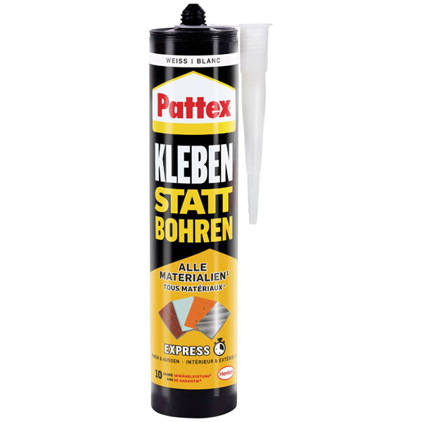 Pattex Kleben statt Bohren Express Adhesive sealant PKBEX 390 g, manufactured by Pattex, is a versatile multi-purpose adhesive designed for quick bonding. This adhesive sealant highlights fast curing and strong bonding without the need for drilling. It is ideal for use in household repairs, construction projects, and DIY tasks.
