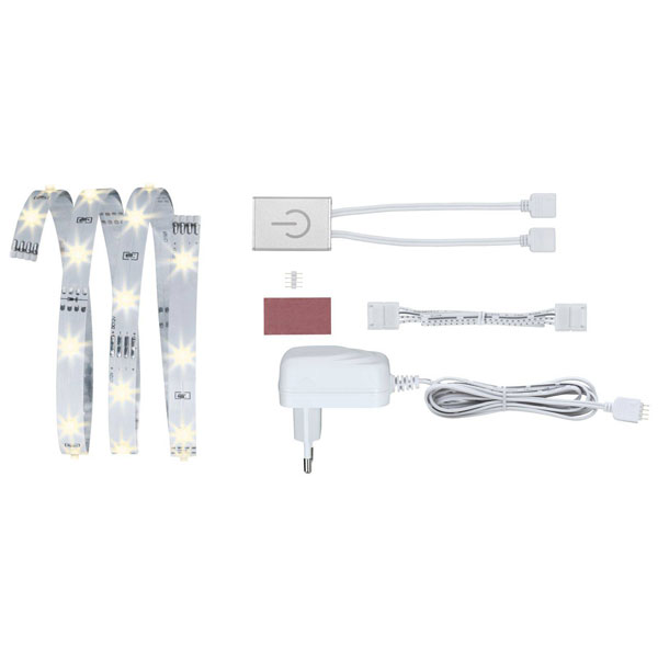 The Paulmann YourLED ECO Comfort 70954 LED Strip Set includes a 1-metre warm white light-emitting diode strip with a 12 V plug. This LED strip provides efficient lighting, making it suitable for various applications such as cupboard lighting. The set is ideal for creating ambient or accent lighting in indoor spaces.