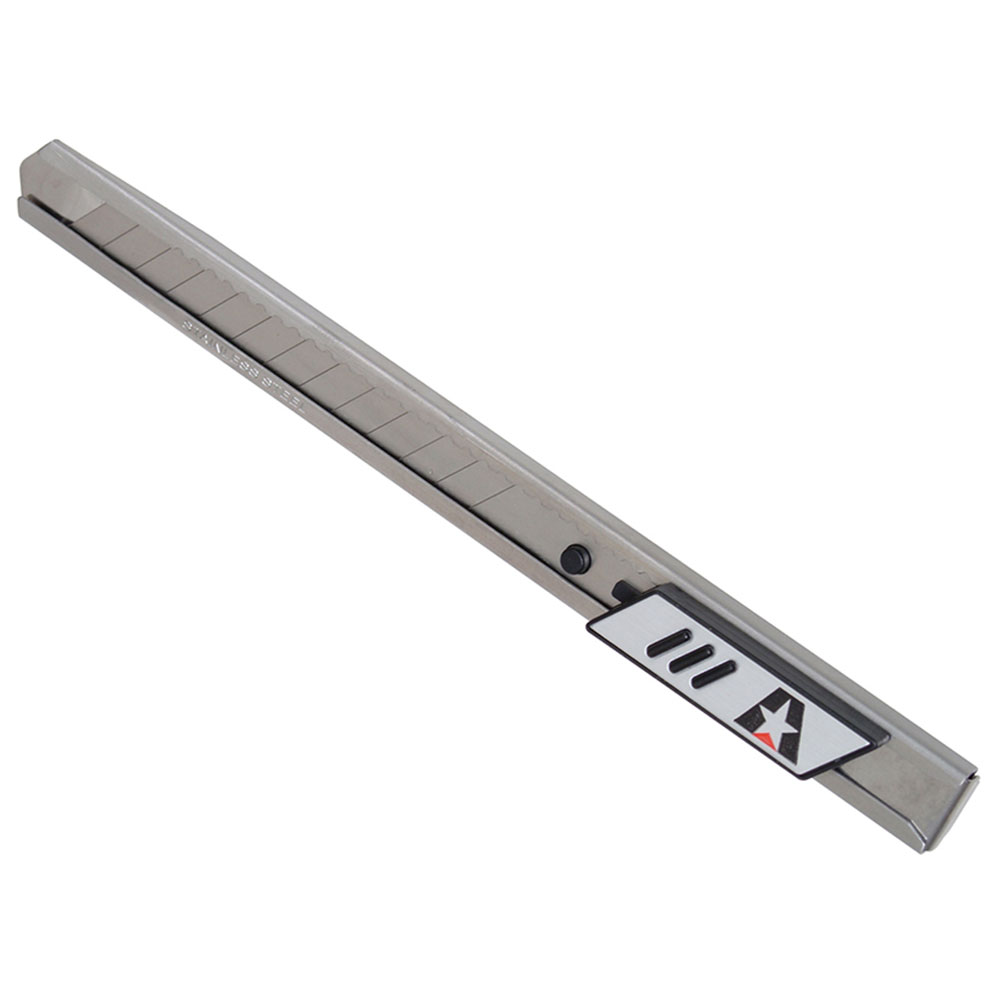 Stainless Steel Snap-Off Knife with a autolock. Its stainless steel body and track make it ideal for use in humid environments. The safety cap also functions as a blade snapper.