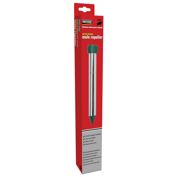 The Pest-Stop (Pelsis Group) Battery Powered Mole Repeller emits low-frequency vibrations through the soil in a circular pattern to deter moles. An environmentally friendly solution with no chemicals or traps. Safe for use around humans, cats, dogs, fish and birds. Made from durable aluminium that is water-resistant from both rain and moisture in the soil.