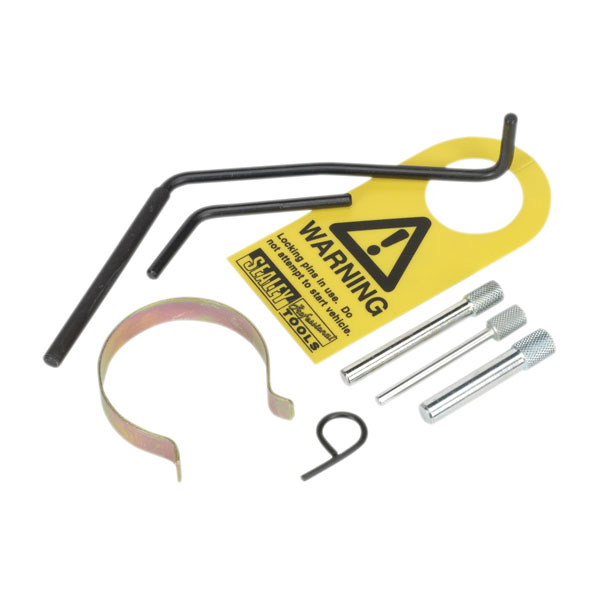 • Kit includes camshaft and flywheel locking pins plus tensioner locking pin and belt retaining clip.