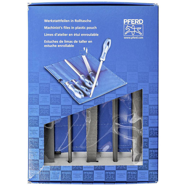 The PFERD 11801520 file set is a comprehensive workshop tool, featuring different files neatly organised in a PVC rollbag with a carton package, each measuring 200 mm in length. Manufactured by PFERD, this set is ideal for precise filing tasks in metalworking and woodworking applications. The practical packaging ensures easy storage and portability for various professional and DIY projects.