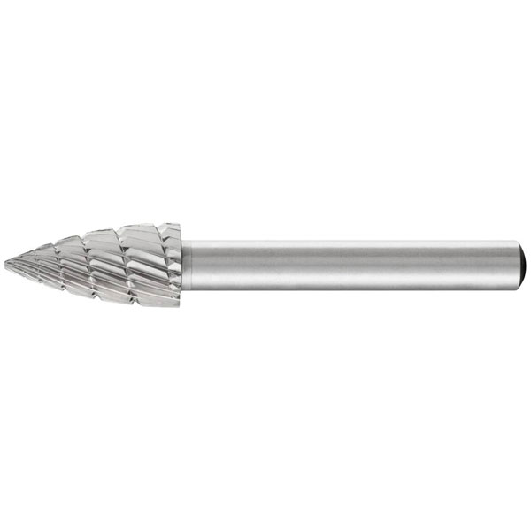 The PFERD 22441336 burr is a high-speed steel tool measuring 60 mm in length with a 10 mm diameter. It features a pointed arch design and a working length of 20 mm, with a 6 mm shank diameter. This burr is commonly used for precise metalworking and deburring applications.