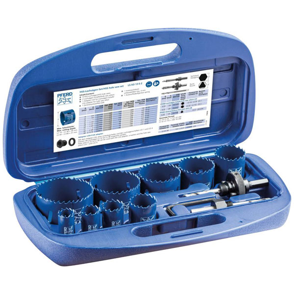 PFERD 25900010 hole saw set with 9 HSS saws and accessories in box