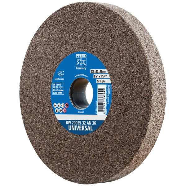 The PFERD BW 20025-32 AN 36 UNIVERSAL is a bench grinder disc with a 200 mm diameter. Manufactured for durability and versatility, it is suitable for grinding various materials. Typical applications include sharpening tools and smoothing surfaces in workshop settings.