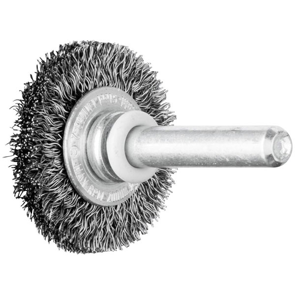 The PFERD Round brush with shaft is designed for use in machine tools. It features untrimmed wires with a thickness of 0.20 mm, ideal for precision cleaning and surface preparation tasks. This versatile wire brush is suitable for removing rust, deburring, and achieving fine finishes on various materials.