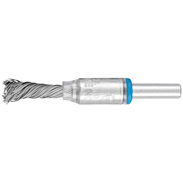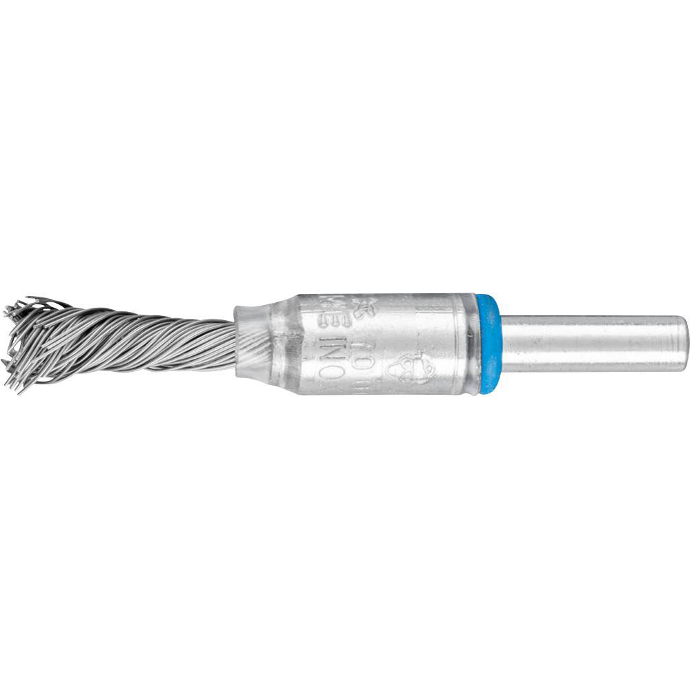 The PFERD end brush with shaft is a robust tool featuring a knotted design and INOX 0.35 wire for enhanced durability. Ideal for precision cleaning and grinding tasks, it is particularly suited for use on stainless steel surfaces. Typically, this machine tool wire brush is employed in metalworking and maintenance industries for efficient surface treatment.