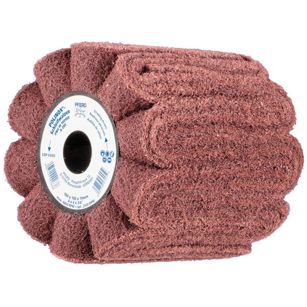 The PFERD 44641203 POLINOX nonwoven grinding roller is designed for fine grinding and finishing with a diameter of 100 x 100 mm and a 19 mm keyway. It features an abrasive pad with an A 280 grit, suitable for creating smooth surfaces. Typical applications include refining and polishing metal or wood surfaces for professional finishes.