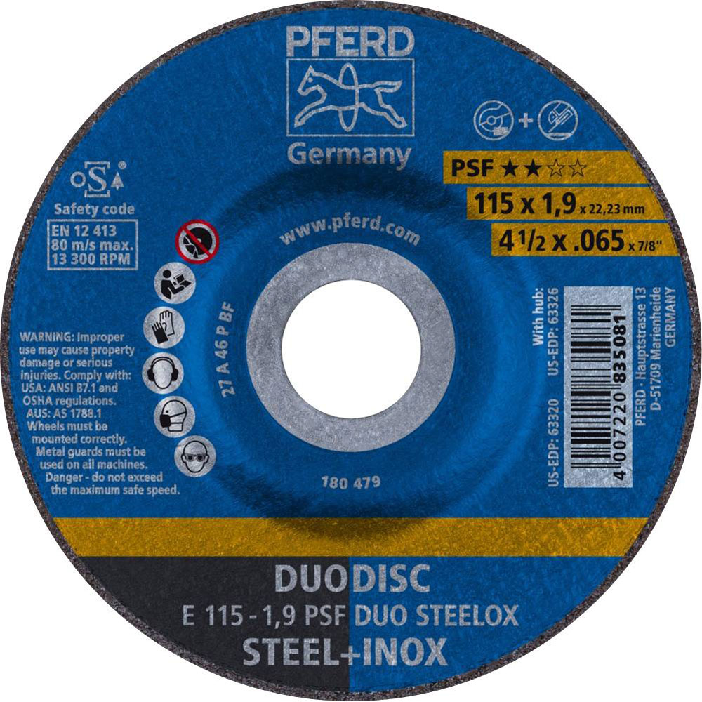 PFERD's E 115-1,9 PSF DUO STEELOX is a grinding disc (off-set) with a diameter of 115 mm and a bore diameter of 22.23 mm, available in packs of 10. This high-performance grinding disc is designed for efficient cutting and grinding of steel and inox materials. It is ideal for use in metal fabrication, construction, and maintenance applications.