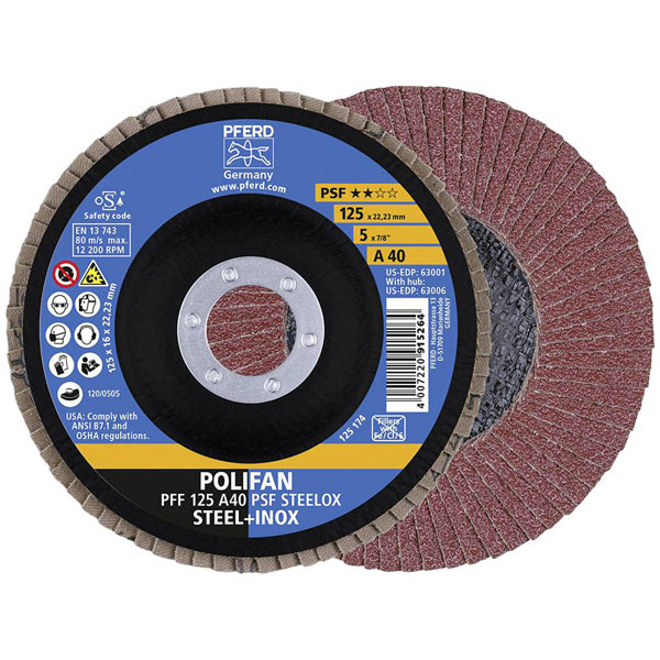 The PFERD 67644125 A Psf Steelox flap disc, with a diameter of 125 mm and a bore diameter of 22.23 mm, comes in a pack of 10 pieces. It features high-performance abrasive properties suitable for grinding and finishing steel and stainless steel surfaces. Ideal for use in metalworking, it provides efficient material removal and high surface quality.