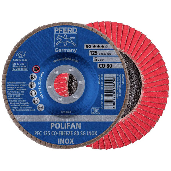 PFERD manufactures the PFC 125 CO-FREEZE 80 SG INOX flap disc with a diameter of 125 mm and a bore diameter of 22.23 mm. This flap disc is ideal for working on nickel or titanium super alloys and stainless steel. It is supplied in packs of 10 pieces and is highly suitable for demanding abrasive tasks.