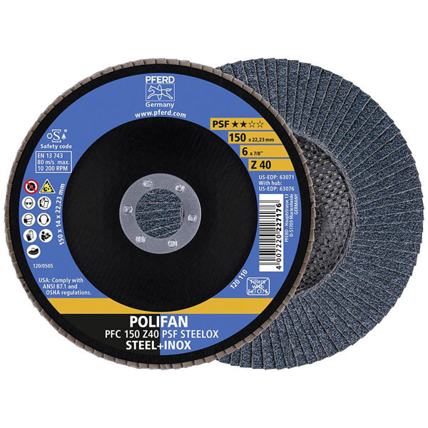 The PFERD 67764150 Z Psf Steelox flap disc has a diameter of 150 mm and a bore diameter of 22.23 mm. It is known for its high-performance abrasive capabilities, making it suitable for grinding and finishing tasks. This product is typically used in metalworking applications to smooth and shape steel surfaces.